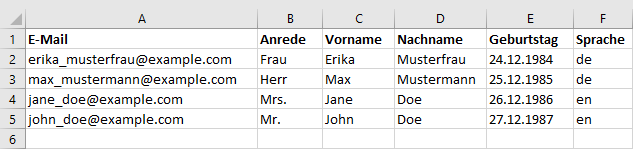 Abonnenten: ImportWahrscheinlich haben Sie bereits eine Liste von Adressen zusammengestellt, die Sie per Newsletter anschreiben möchten. Über das universelle CSV-Dateiformat lassen sich Ihre Adressen aus nahezu jeder Datenbank oder Tabellenkalkulation (z. B. Microsoft Office oder Open Office) exportieren und anschließend in IT&O-Versand importieren. Um die Zuordnung der Spalten (z. B. Vorname, Nachname, E-Mail) beim Import zu erleichtern, sollte die erste Zeile Ihrer CSV-Datei aussagekräftige Spaltenüberschriftten enthalten. Ein Beispiel:
