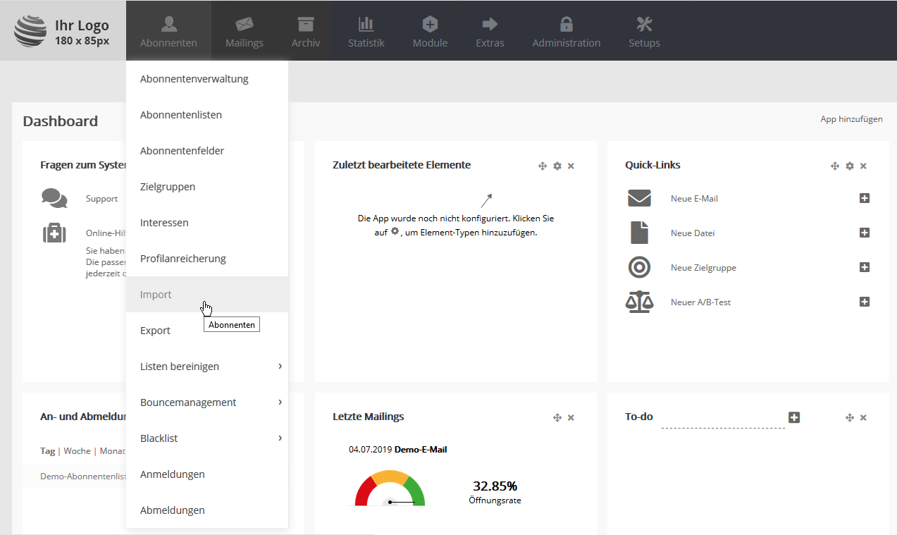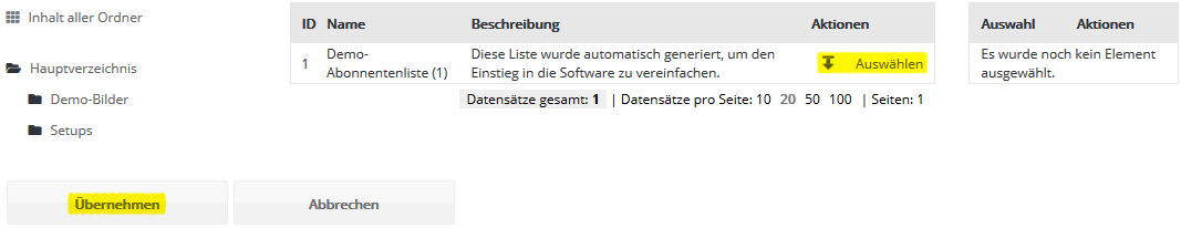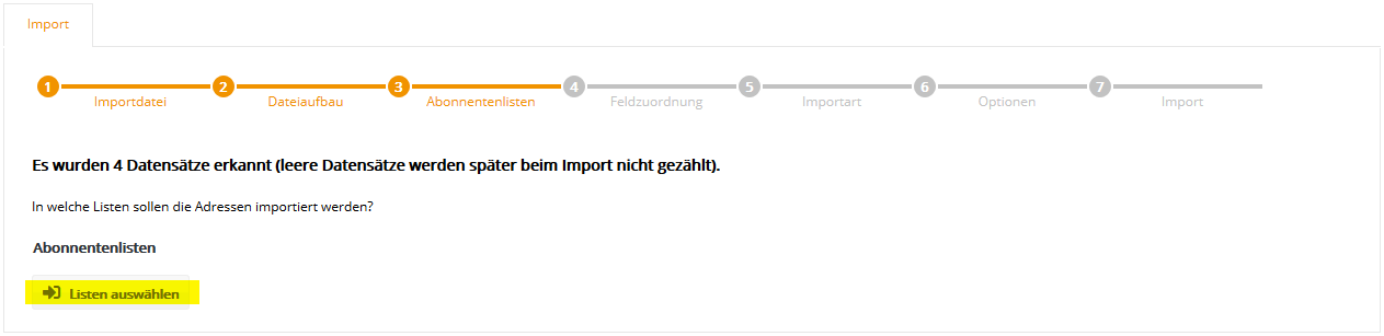 Schritt 3 - AbonnentenlistenWählen Sie nun aus, in welche IT&O-Versand Abonnentenliste ihre CSV-Datei importiert werden soll. Falls Sie zuvor keine eigene Abonnentenliste in IT&O-Versand angelegt haben (siehe Menü Abonnentenlisten), steht zum schnellen Einstieg die leere Abonnentenliste 'Demo-Liste' bereit. Diese Liste wird in der Regel bei der Einrichtung Ihres IT&O-Versand Kontos angelegt und zur Demonstration mit einem Beispiel-Abonnenten befüllt.