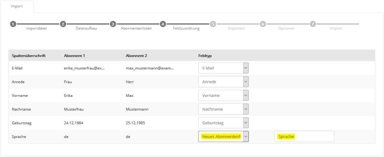 Auch die Auswahl mehrerer Abonnentenlisten ist möglich, falls Sie parallel in mehrere Listen importieren möchten. Klicken Sie nach Auswahl der gewünschten Liste(n) auf 'Übernehmen' und anschließend auf 'Weiter'. Der Name einer Abonnentenliste lässt sich im Menü Abonnentenlisten auch nachträglich jederzeit ändern. Schritt 4 - FeldzuordnungIn Schritt 4 teilen Sie IT&O-Versand mit, welche Spalte (z.B. Vorname, Nachname) Ihrer CSV-Datei in welches IT&O-Versand Abonnentenfeld importiert werden soll. Zum schnellen Einstieg sind typische Abonnentenfelder wie 'E-Mail', 'Anrede', 'Vorname' und 'Nachname' in IT&O-Versand bereits vorhanden.