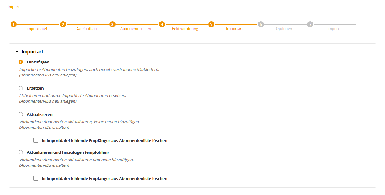 Auf der linken Seite sehen Sie am Beispiel der ersten beiden Abonnenten noch einmal den Inhalt Ihrer CSV-Datei. Auf der rechten Seite wählen Sie bitte den 'Feldtyp', der zum jeweiligen Inhalt passt. Dabei übernimmt IT&O-Versand die Zuordnung automatisch, wenn der Name von CSV-Spaltenüberschrift und IT&O-Versand-Abonnentenfeld übereinstimmt. Wird automatisch kein passendes Abonnentenfeld gefunden, ist der neue Feldinhalt zunächst auf 'nicht importieren' gesetzt. Wählen Sie in dem Fall entweder eines der vorhandenen Felder aus, oder nutzen Sie die Option 'neues Abonnentenfeld', um ein neues Feld anzulegen und ihm einen Namen zu geben. An dieser Stelle erhalten neue Felder grundsätzlich den Typ 'mehrzeiliger Text', siehe auch nachfolgender Tipp. Klicken Sie anschließend auf 'Weiter'. --> Tipp: Idealerweise sollten Sie sich bereits vor dem Import einmalig die Zeit nehmen, im IT&O-Versand Menü 'Abonnentenfelder' alle Felder so anzulegen, dass Feldname und Feldtyp zu Ihren importierten Daten passen. Damit profitieren Sie zukünftig von der automatischen Feld-Zuordnung, was bei wiederkehrenden Importen nicht nur Zeit spart, sondern auch eventuelle Fehler durch unpassende Feldtypen oder die manuelle Feld-Zuordnung verhindert. Schritt 5 - ImportartHier legen Sie fest, wie Ihre neu importierten Daten mit den vorhandenen 'alten' Daten der gewählten IT&O-Versand-Abonnentenliste(n) abgeglichen werden sollen.