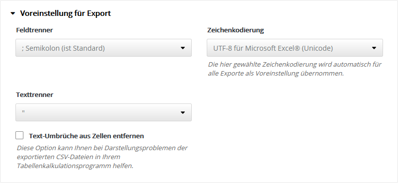 Folgende 'HTML-Editoren' sind in IT&O-Versand integriert und nutzbar: Grundeinstellung ExportHier legen Sie die Voreinstellung für den Export von CSV-Dateien fest, z. B. für den Export von Abonnentendaten. Bei der Durchführung jedes Exportes können Sie bei Bedarf auch eine abweichende Einstellung wählen. Standardeinstellung ist die Option 'UTF-8 für Microsoft Excel® (Unicode)', technisch gesprochen 'UTF-8 mit BOM'. Dieses Format wird von den meisten Officeanwendungen automatisch erkannt, so dass Umlaute und Sonderzeichen ohne manuelle Formatwahl korrekt importiert werden. StatistikeinstellungenTragen Sie Ihre eigenen Maximalwerte ein, um die rot|gelb|grün Farb-Umschaltung der Statistik-Anzeige für Öffungsrate, Klickrate und Bouncerate an die typischen Werte Ihrer Mailings anzupassen. Nur Ihre besten Mailings sollten den grünen Bereich erreichen. Die Farb-Umschaltung erfolgt automatisch in Drittel-Stufen des eingetragenen Maximalwertes. Empfehlung: Notieren Sie aus der Statistik Ihrer bisherigen Mailings die Durchschnittswerte für Öffnungsrate, Klickrate und Bounces. Damit dieser Durchschnittswert zukünftig im mittleren Drittel der Skala landet, tragen Sie das Doppelte dieses Wertes als Maximum in das jeweilige Feld ein. Tragen Sie z. B. 30% als Maximum ein, dann werden anschließend die Werte bis 10% rot, bis 20% gelb und darüberliegende Werte grün gefärbt. Sie sehen sofort, ob Ihr aktuelles Mailing über- oder unterdurchschnittlich abschneidet. Typische Durchschnittswerte: