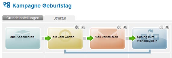 - advanced: Using this module you can create your campaigns as extensive as you like to. You also are able to connect multiple campaigns to each other. That way you may react on a variety of events and reach an extremely high degree of email-personalization. In addition to the common function blocks as 'wait', 'send' and 'jump', you can also use the advanced functions 'splitter', 'condition' und 'profile enhancement'. Further the advanced jump-function is connectable to every other function block, even from other campaigns. This way, you can create an almost unlimited number of use cases as target group customized newsletters, individualized welcome series or reminders for upcoming happenings.