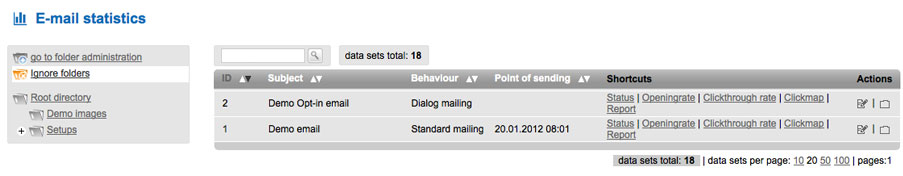 Here you find the statistics of all sent mails. For easier access IT&O-Versand already includes a demo-mail you can view. |