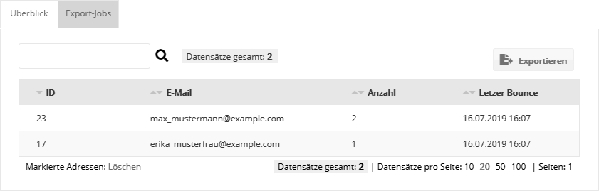Reiter 'Überblick'Hier werden alle E-Mail-Adressen aufgelistet, deren Versendungen aufgrund von drei aufeinanderfolgenden Hardbounces zurückgehalten werden. Diese Adressen werden auf der IT&O-Versand-internen 'Retained List' gesammelt. Verwaltet werden hier ausschließlich die reinen E-Mail-Adressen, unabhängig von den dazugehörenden (eventuell ehemaligen) Abonnenten. Oben rechts können Sie mit Klick auf den 'Exportieren'-Button die zurückgehaltenen E-Mail-Adressen als CSV-Datei exportieren. Die erzeugte CSV-Datei lässt sich anschließend auf dem Reiter 'Export-Jobs' herunterladen.