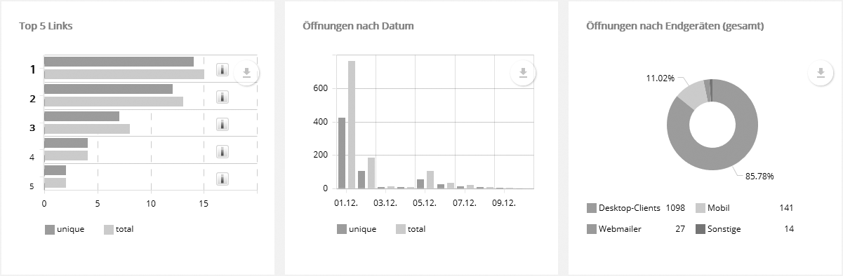 Per Klick auf 'Vollbild' wird die Karte im gesamten Fenster dargestellt. Direkt unter dem Vollbild-Link können Sie per Download-Button die Grafik der Karte in verschiedenen Formaten herunterladen. Hinweis: Obwohl IP-Adressen grundsätzlich nicht an einen bestimmten Ort gebunden sind, lässt sich durch die bekannten IP Adressräume von Internetprovidern, Universitäten und ähnlichen Einrichtungen in vielen Fällen der Standort ermitteln. Da regionale Einwahlknoten häufig einen festen IP-Adresspool besitzen, funktioniert das Verfahren auch bei dynamischer IP-Vergabe. Für die Zuordnung nutzt IT&O-Versand eine regelmäßig aktualisierte lokale Kopie einer Geotargeting-Datenbank, die ein externer Dienstleister zur Verfügung stellt. --> Top 5 Links + Öffnungen nach Datum und EndgerätenWie bei jedem anderen Diagramm lassen sich auch hier per Download-Button (rechte obere Ecke) die angezeigten Daten als Grafik- oder Excel-Datei herunterladen. Einzelne Diagramm-Segmente lassen sich ein- oder ausblenden, indem man auf den entsprechenden Punkt in der Legende klickt, z.B. auf 'Desktop-Clients' im Diagramm 'Öffnungen nach Endgeräten'. Damit werden die übrigen Segmente auf 360° gezoomt und deren Prozentzahlen passen sich der neuen Anordnung an. So lässt sich das Verhältnis beliebiger Segmente direkt vergleichen.