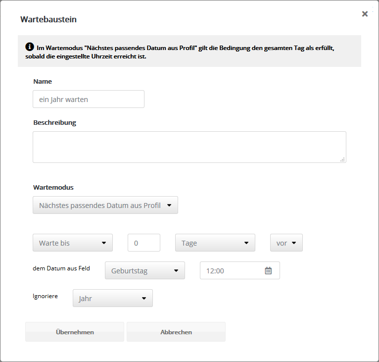 Im Wartebaustein stellen Sie ein, wie lange (Zeitraum) oder bis wann (Zeitpunkt) der Abonnent warten soll, bevor er den nächsten Baustein betritt.