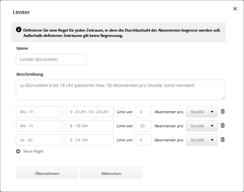 Definieren Sie eine Regel für jeden Zeitraum, in dem die Durchlaufzahl der Abonnenten begrenzt werden soll. Außerhalb definierter Zeiträume gilt keine Begrenzung. Treffen auf einen Zeitraum mehrere Regeln zu, gilt die strengste Regel.